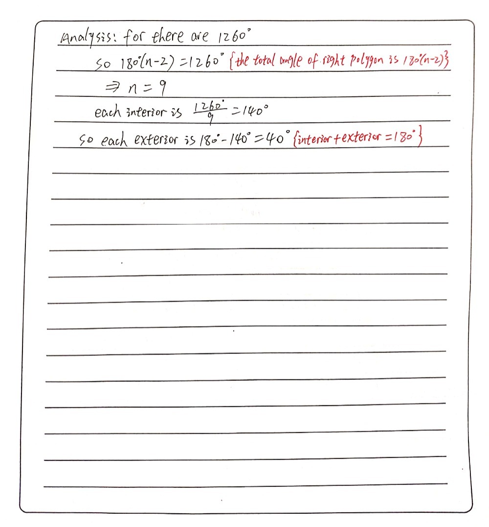 1 from Check spelling or type a new query. We did not find results for: Maybe you would like to learn more about one of these? Calculate the sum of all the interior angles of the polygon. Each of the interior angles of a regular polygon is 140°.